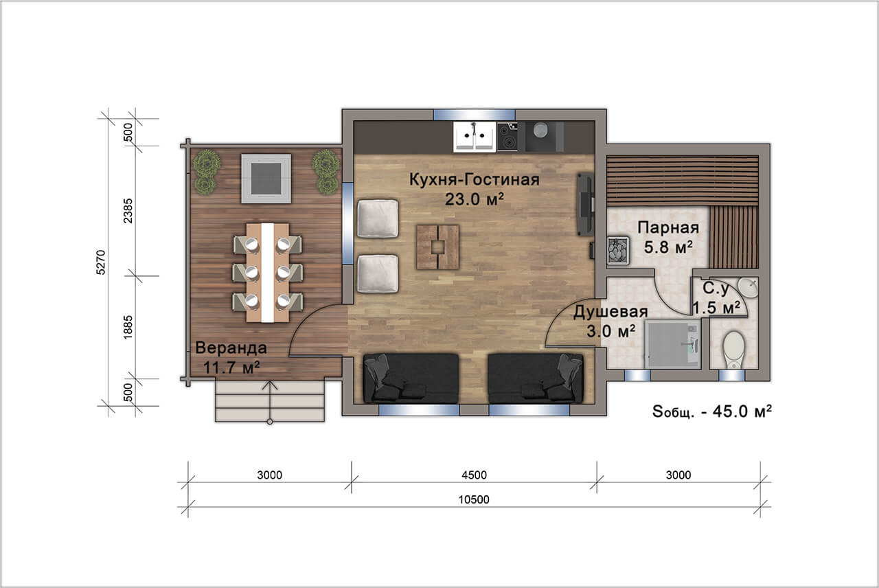 - Общая площадь — 45 кв.м.;