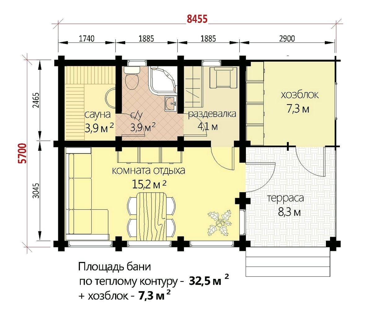 баня по технологии двойного бруса держит тепло несколько суток даже зимой вы на следующий день можете помытся в теплой бане из двойного бруса и вам будет комфортно в бане из бруса . прогревается баня под ключ из бруса за 40 минут благодаря стене из теплого бруса проект бани из бруса вы можете скорекцировать под себя перенести двери окна в бане сместить либо добавить стену по технологии двойной брус цвет покраски бани на ваш выбор . фундамент под баню может быть нескольких видов свайно винтовой буро набивной бетонные столбики , на ростверке с монолитной плитой , фбс блоки , монолит фундамент под баню из бруса вы можете выбрать самостаятельно в зависимости от почвы на вашем участке для строительство бани