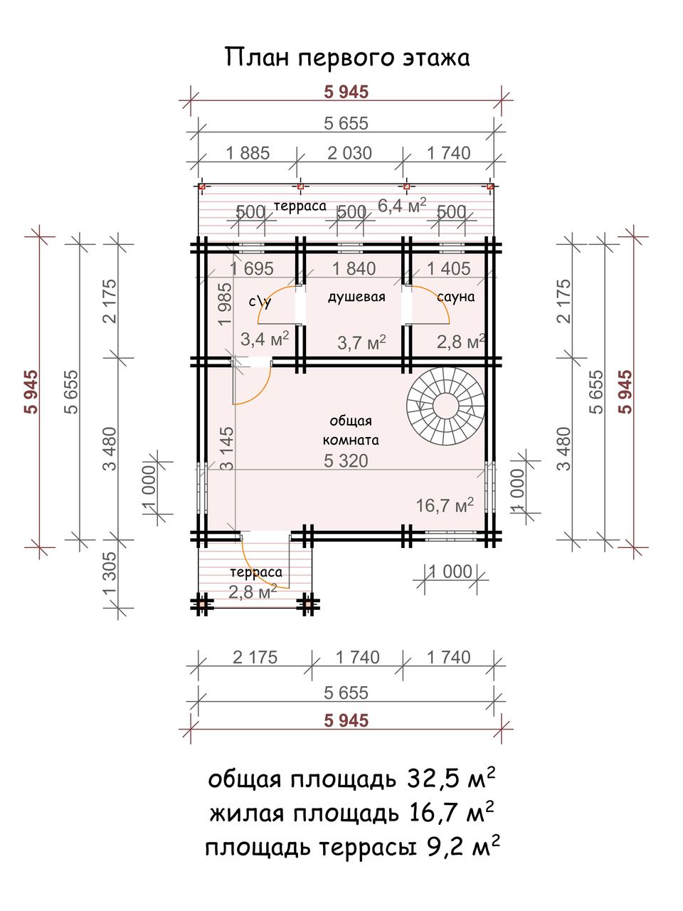 Площадь первого этажа бани по теплому контуру — 32,5 м2