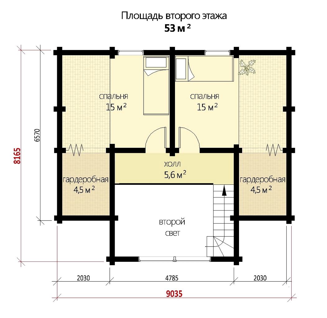 Площадь второго этажа по теплому контуру - 53 м2 ( второй свет 14 м2)