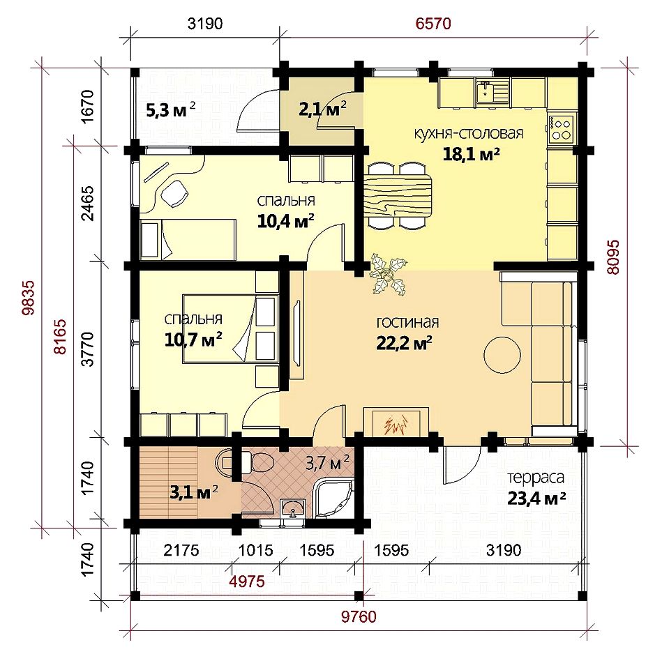 Площадь крытых террас - 28,7 м2