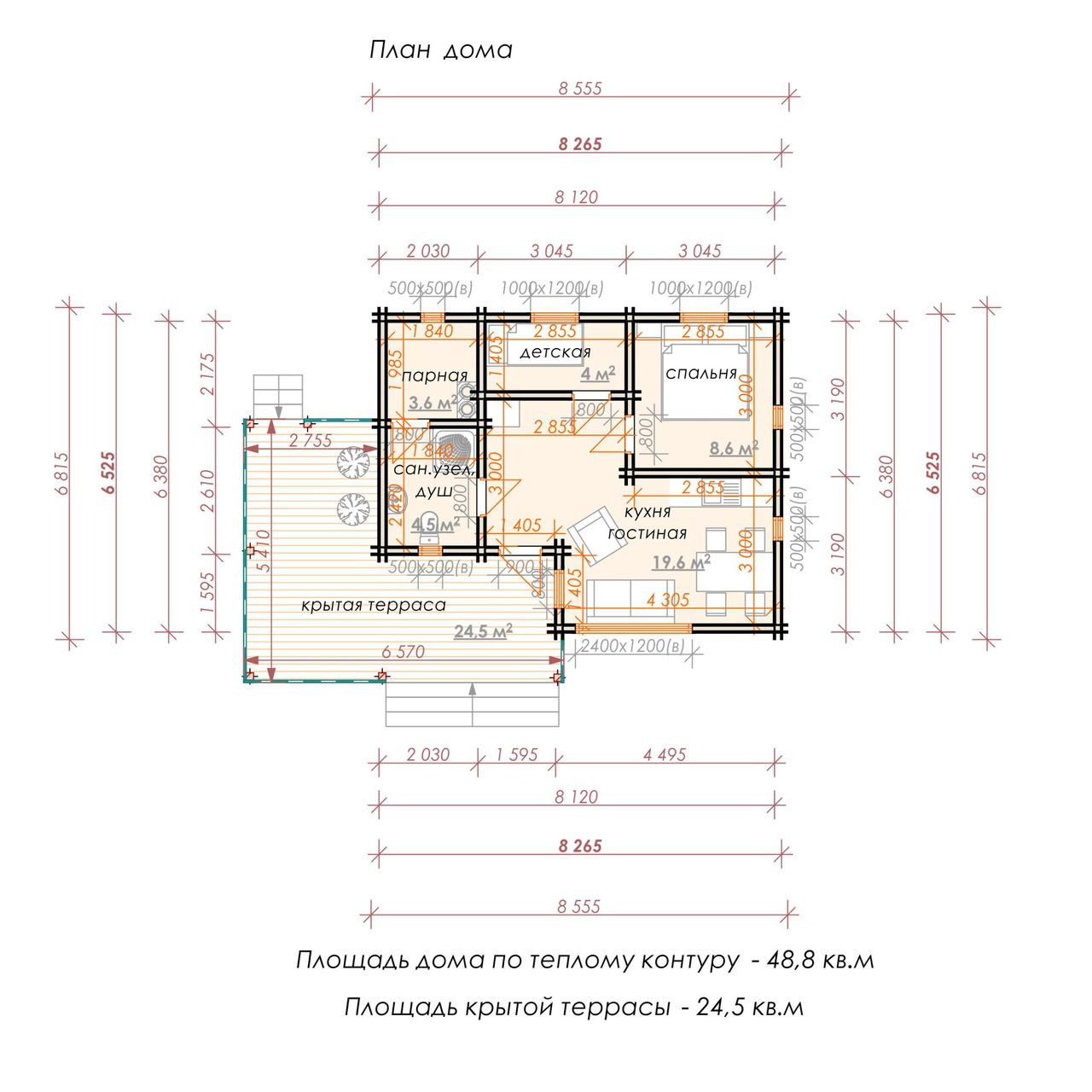 Площадь первого этажа по теплому контуру - 48,8  м2
