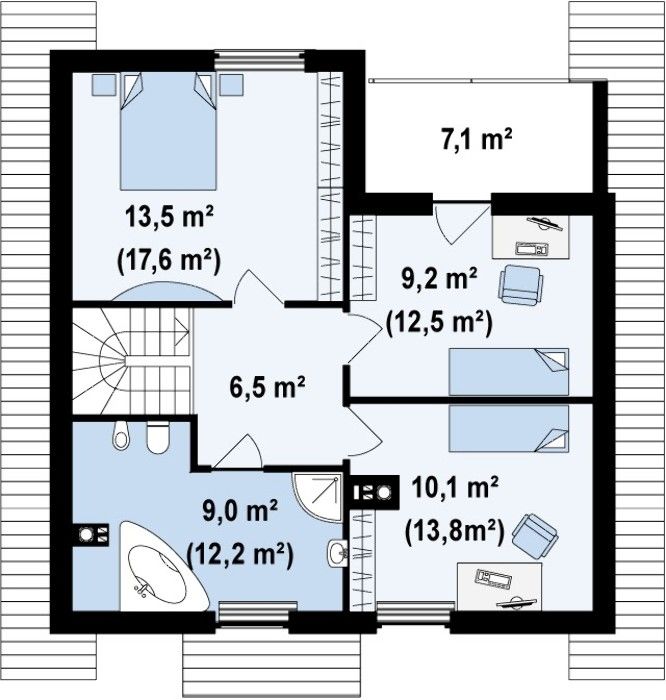 Площадь мансардного этажа по теплому контуру - 62,6 м2