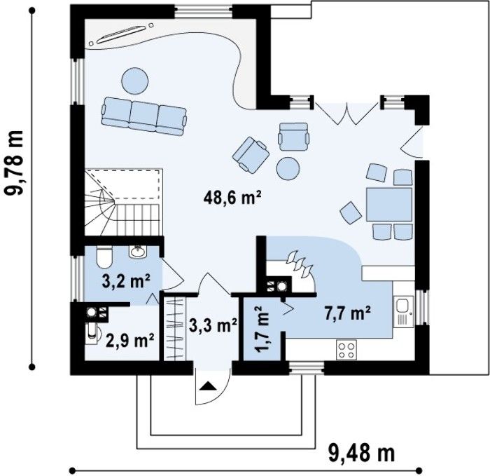Площадь первого этажа по теплому контуру - 92,7 м2