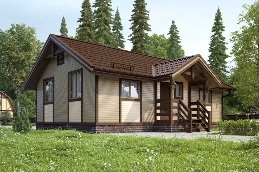 В базовую комплектацию входит: свайно-винтовой фундамент, домокомплект зимнего дома с толщиной стены 182 мм (имитация бруса 20 мм + минеральная вата 150 мм + вагонка 12 мм), утепленный пол, утепленная крыша, окна (двойной стеклопакет), деревянные межкомнатные двери, входная металлическая дверь, покрытие крыши кровельным материалом (ондулин), монтаж дома.