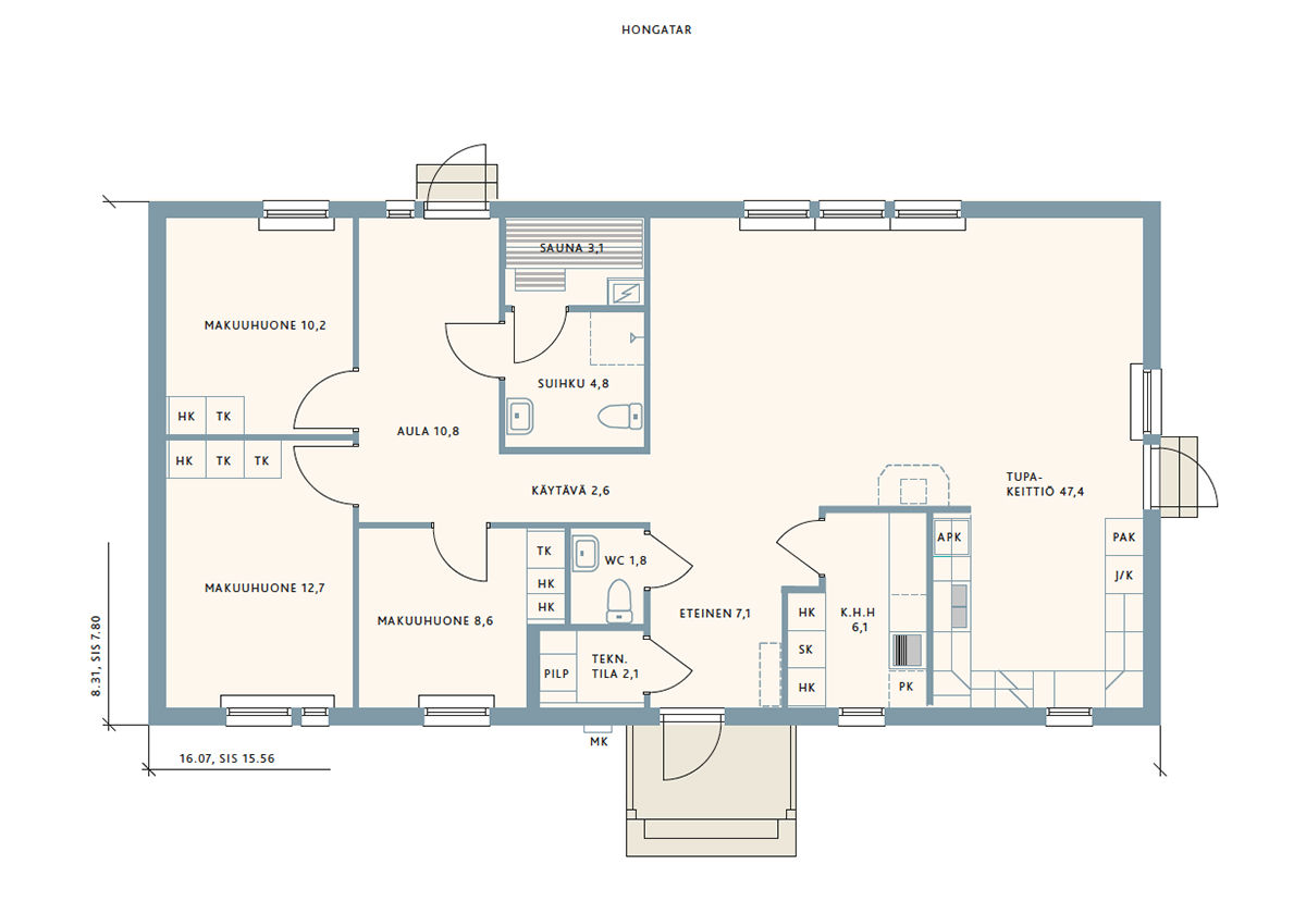 Размер дома 16070х8310 мм + терраса 16,6 кв.м + крыльцо 2 кв.м