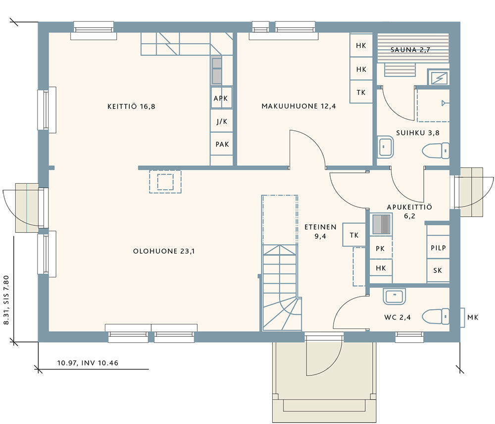 Размер дома 10970х8310 мм + терраса 25 кв.м + крыльцо 2,0 кв.м