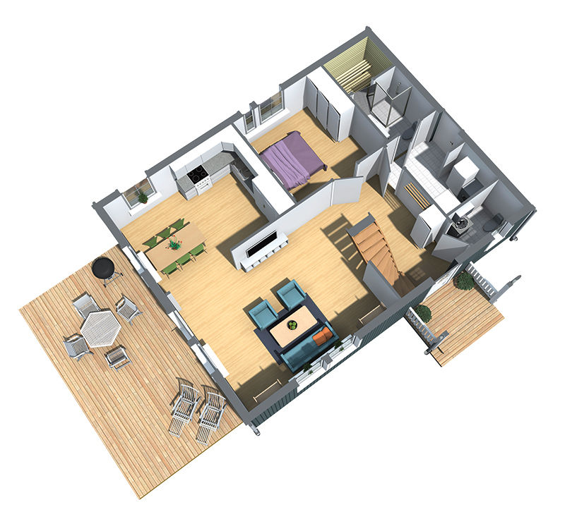 В базовую комплектацию входит: свайно-винтовой фундамент, домокомплект зимнего дома с толщиной стены 182 мм (имитация бруса 20 мм + минеральная вата 150 мм + вагонка 12 мм), утепленный пол, утепленная крыша, окна (двойной стеклопакет), деревянные межкомнатные двери, входная металлическая дверь, покрытие крыши кровельным материалом (ондулин), монтаж дома.