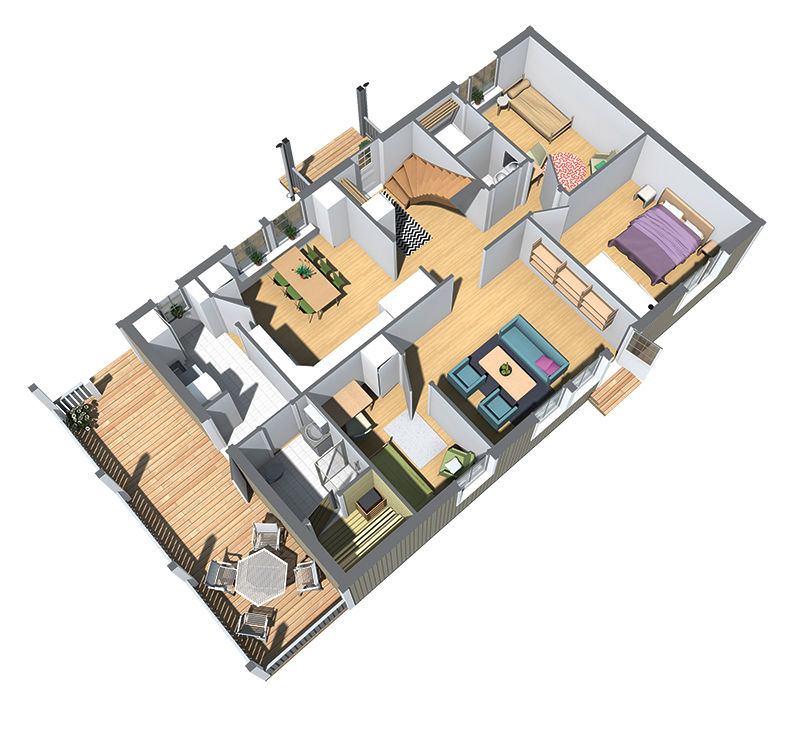 В базовую комплектацию входит: свайно-винтовой фундамент, домокомплект зимнего дома с толщиной стены 182 мм (имитация бруса 20 мм + минеральная вата 150 мм + вагонка 12 мм), утепленный пол, утепленная крыша, окна (двойной стеклопакет), деревянные межкомнатные двери, входная металлическая дверь, покрытие крыши кровельным материалом (ондулин), монтаж дома.