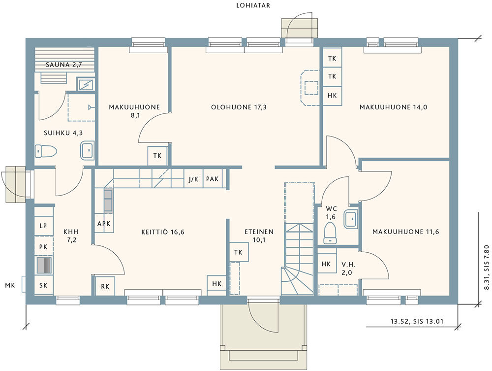 Размер дома 13520х8310 мм + терраса 16,6 кв.м + крыльцо 2,0 кв.м