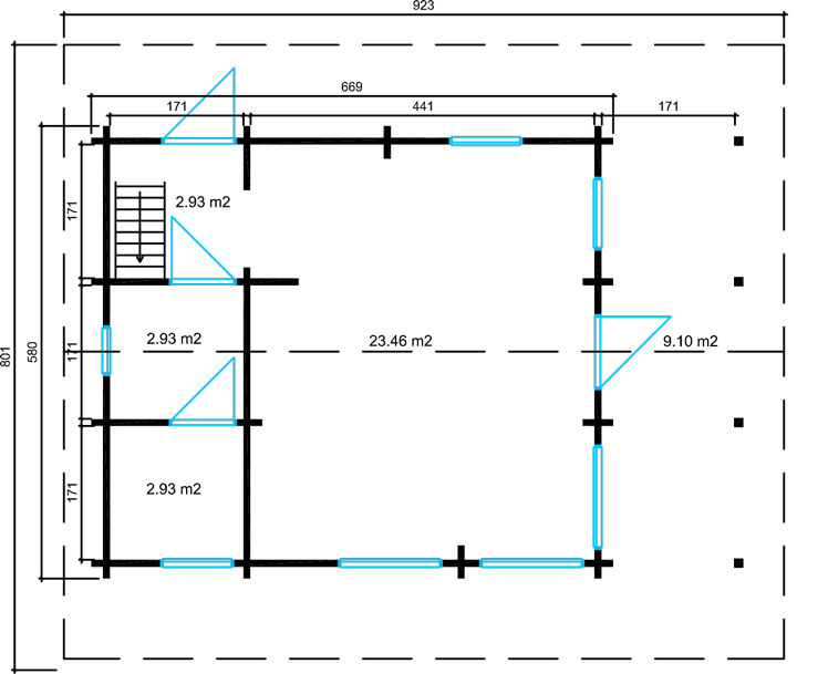 - Размеры с свес крыши: 923 х 801 см