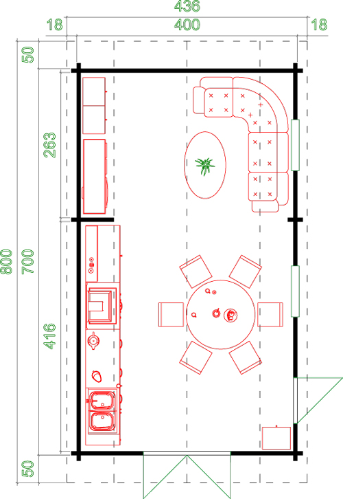 - Двери, со стеклопакетом или цельное дерево (в зависимости от модели), порожек покрыт нержавейкой или алюминием, с замком и ручками, вкл. внутренние и внешние наличники.