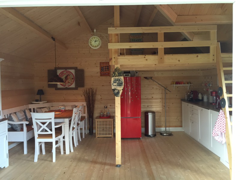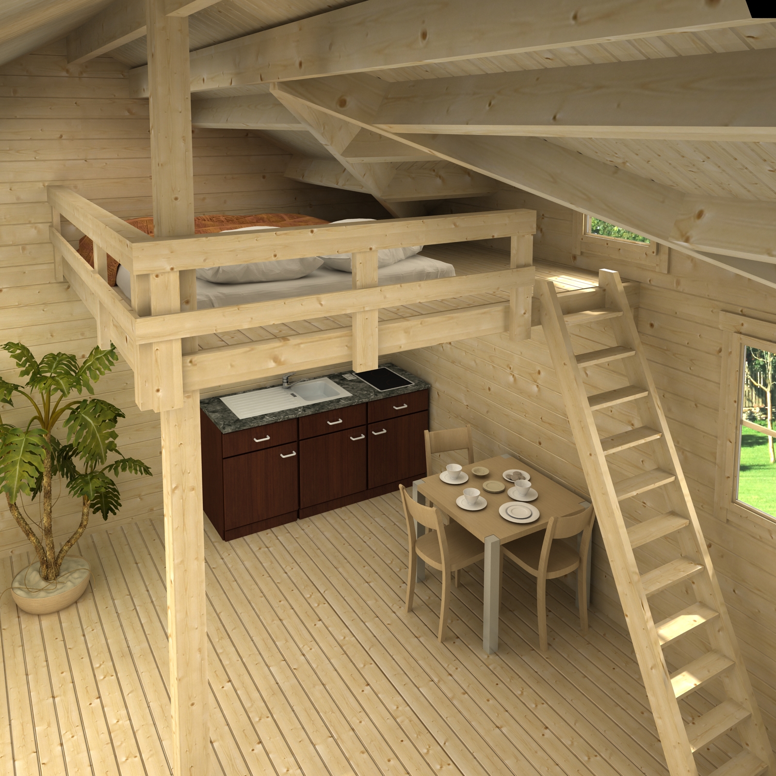 дом -44 состоит из большой комнаты со встроенным спальный этаж (около 4,5 м2) и крытой террасой. В комплект поставки входит массивный лестницы лестницы для кровати-чердака принадлежит. Все окна и двери оснащены стеклопакетов и резиновых уплотнителей. Окна о Это полный комплект ВКЛ. Полы, пропитанные деревянный Фундамент, монтажные материалы и план строительства.